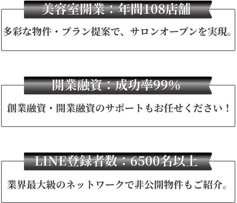 もしくは、不動産契約を先にする場合もあります。⇧その場合リスクもともなうのでしっかり判断した上で美容室専門の不動産屋ではやっています。条件が揃わないとやりません。※あくまでも美容室専門の不動産屋実績によるものです。